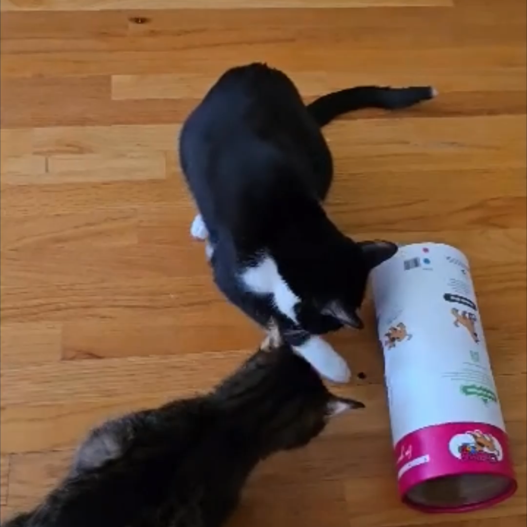 for this wonderful donation. You were spot on with the idea to give them to cats! Here is 2 videos of my cats with it. I had to resize it for email but if you would like a better quality I can work on it.  My tuxedo cat, Angus, is obsessed! The dogs are next!  -Becca